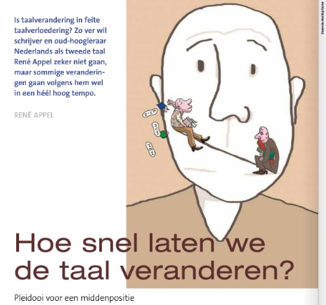 En ik heb daar ook op gereageerd met een lange reactie en die heb ik hier op deze pagina geplaatst, omdat het goed weergeeft hoe ik al heel lang over taal denk. En dat is voor mij niet in conflict met het braaf volgen van de groene spelling en dat ik voor een standaardtaal ben. En dat laatste is ingegeven doordat je wel met enthousiasme taalvariatie kan bestuderen, maar dat je ook een eigen subjectieve taalbeheersing hebt. Ook al ben je nog zo neutraal, je zal je eigen kinderen altijd proberen om jouw opvattingen over taal over te dragen. En dan probeer je al jong hun hebben af te leren. Niet omdat het fout is, maar lelijk. Ook dat oordeel is voor mij van belang. Maar ik wil niet zoals René Appel voorstelt, om er een Taalbewaker voor aan te stellen. En dit raakt ook niet de kern van taalverandering. Die vindt gewoon onherroepelijk plaats. Wees geen pessimist of optimist, maar een realist. En als je idealistisch bent, je hoeft niet zelf mee te veranderen om de anderen wel de taal te laten aanpassen.