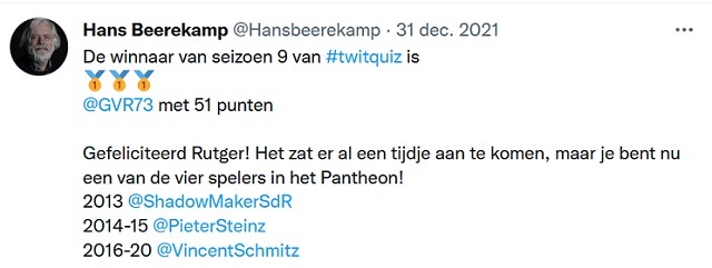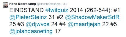 Dit jaar is wederom met overmacht de Twitquiz gewonnen door Rutger Kiezebrink (@GVR73), proficiat! Maar iedereen die al was het maar n opgave als eerste wist, ook gefeliciteerd, want de quiz stopt wellicht, maar het is een onsterfelijk makende prestatie als je een keer de Twitquiz wist te winnen.