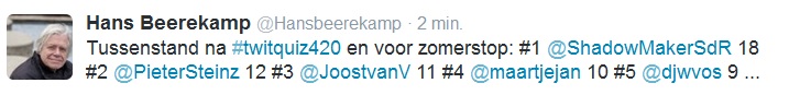 De Twitquiz is begin 2013 gestart. Na de zomerstop van dat jaar is de stand weer op nul gezet. De nummer een van de eerste reeks was Sander de Regt, die ook nu bovenaan staat. Mogelijk dat bij de Twitquiz van de #500e opgave weer een eindstand wordt opgemaakt. Dat zal dan ergens begin november 2014 zijn. Hans Beerekamp heeft een moment om te resetten in gedachte, maar laat zich er verder nog niet over uit. Vanavond weer een overwinnig en consolideer mijn derde plaats.