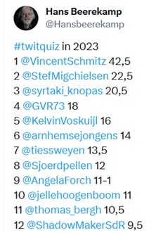 Eindstand 10e en mogelijk laatste jaar van de #Twitquiz, 31 december 20-22