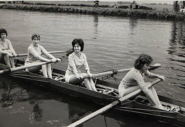 Foto Dames 4, omstreeks 1958 (v.r.n.l.): Anja de Liema (slag), Lilly van Leeuwen, Titia Lely en Julian Kramer (boeg). Stuurvrouw was Eliane Jans(s)en (niet op de foto). Bron: Michiel van Loon
