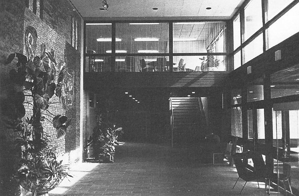 Maar meestal ging je naar het uiteinde van de hal, die toegang gaf tot de aula met een professioneel toneel. Van daaruit kon je weer verder het gebouw in, maar ook weer doorlopen naar de fietsenkelder.
